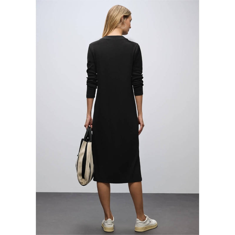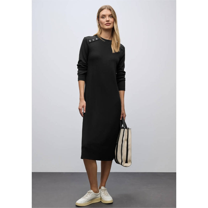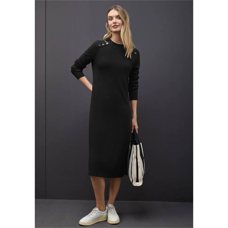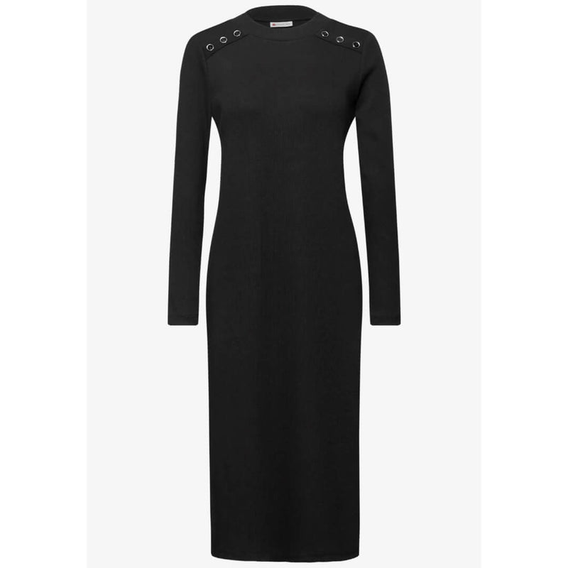 Street One mekko. Rento trikoomekko pehmeässä ja joustavassa rib-laadussa. Mekossa on pystykaulus, koristenapit olkapäällä ja halkiot sivusaunassa. Hyvin istuva mekko on miellyttävä käytössä. Mekon mitat koossa 38 on rinnnanympärys 94cm, helma 106cm ja pituus 116cm