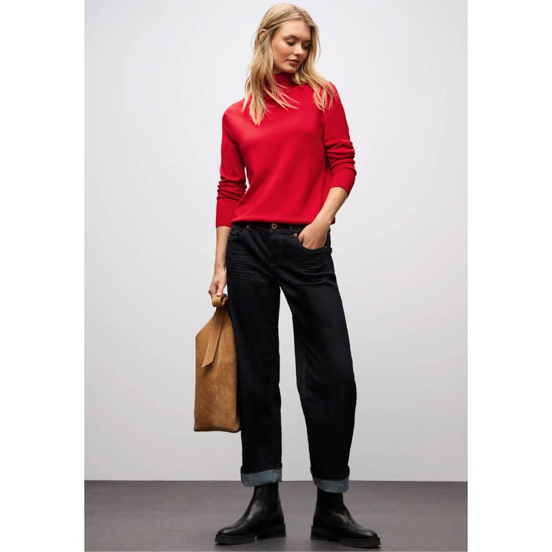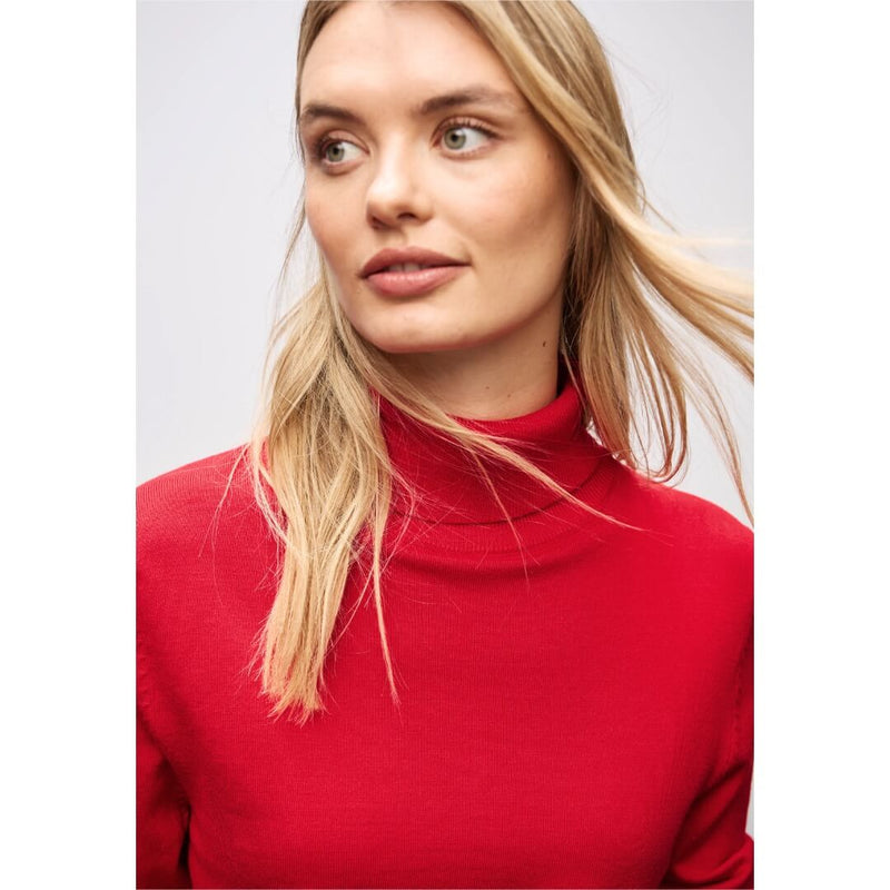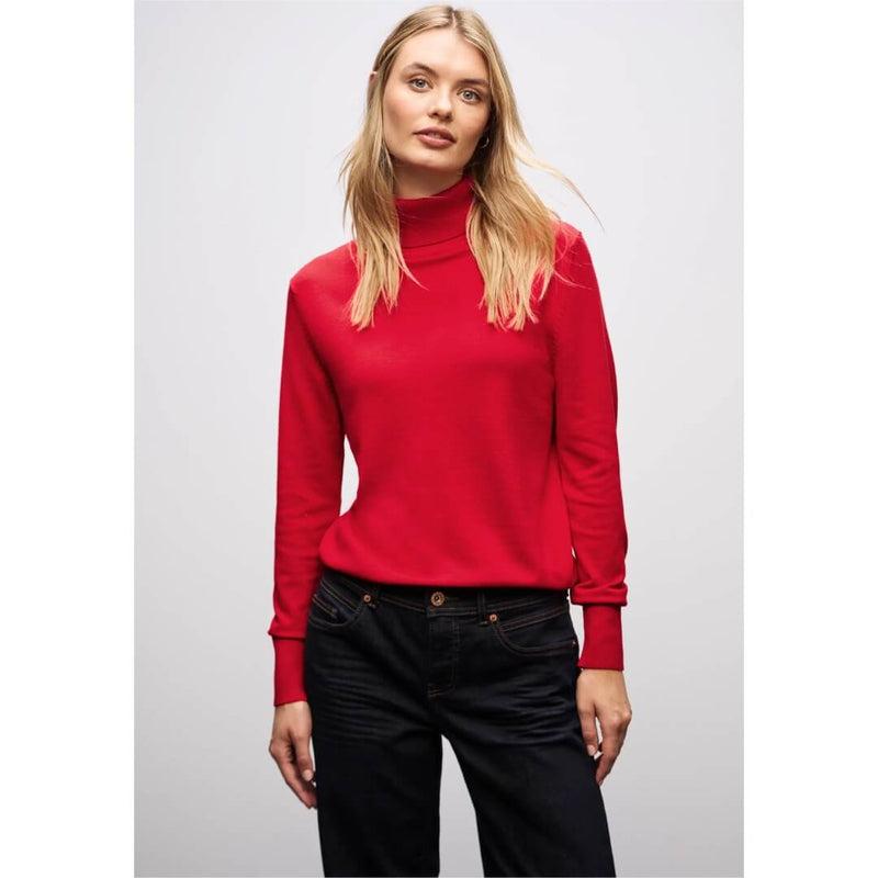 Street One pooloneule. Keveä pooloneule pehmoisessa viskoosilaadussa. Neuleessa korkea poolokaulus. Hyvin istuva hieman kavennettu pooloneule ei ole liian paksu vaan se toimii hyvin vaikka jakun alla. Neuleen mitat koossa 38 on rinnnanympärys 98cm, helma 88cm ja pituus 60cm