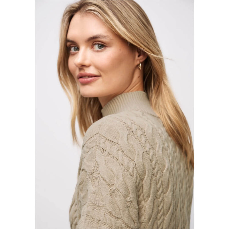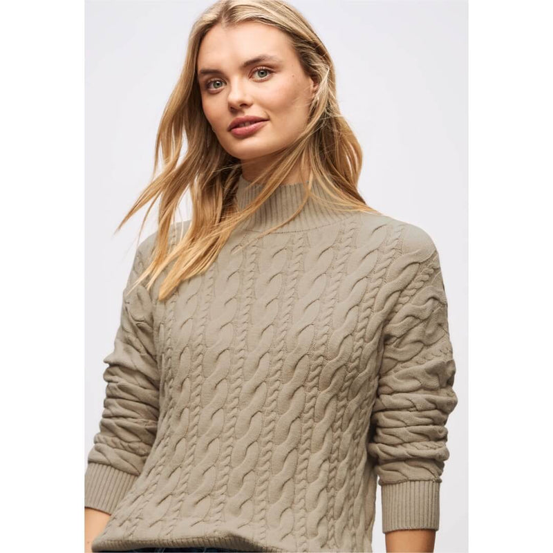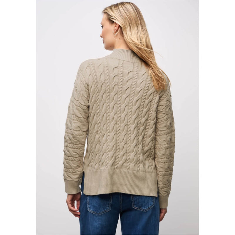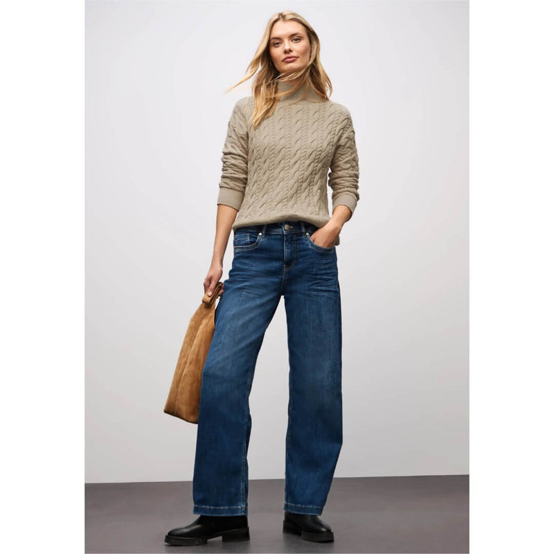 Street One neule. Pehmeä hyvin laskeutuva kaapelineule pienellä pystykauluksella. Neuleen mitat koossa 38 on rinnanympärys 108cm, helma 104cm ja pituus 60cm