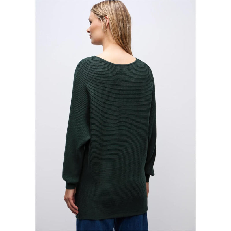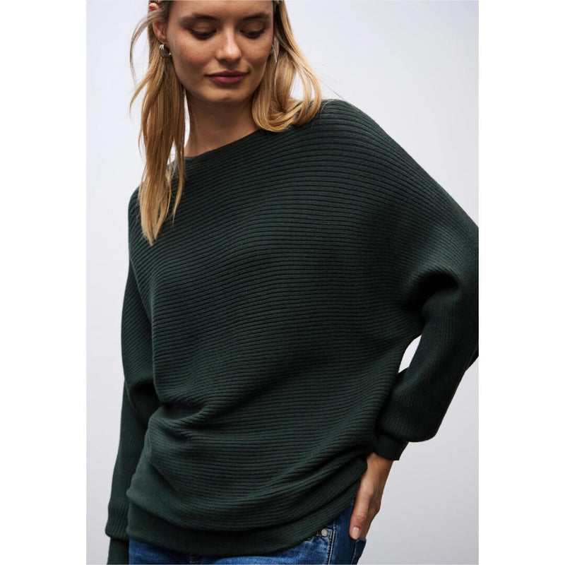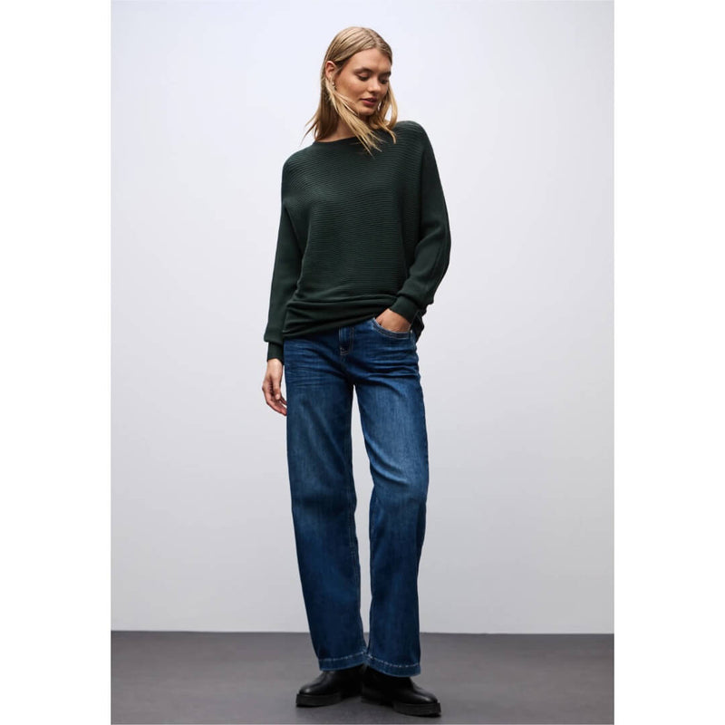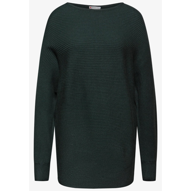 Street One neule. Struktuuripintainen neule venepääntiellä. Keveä ja pehmeä neule hieman pidemmässä mallissa ja vaakaraitastruktuurissa. Neuleen mitat koossa 38 on rinnanympärys 112cm, helma 96cm ja pituus 60cm