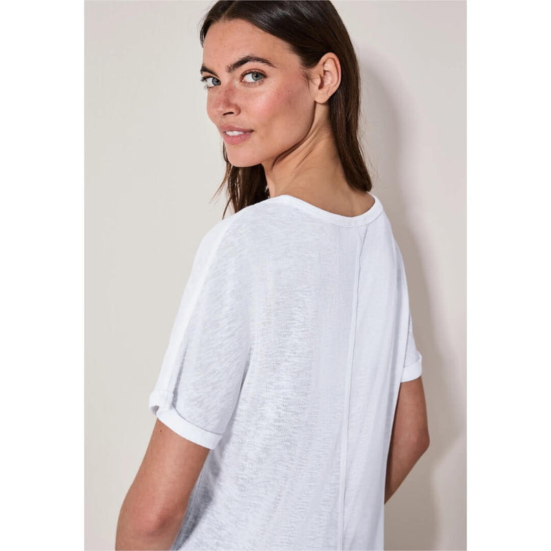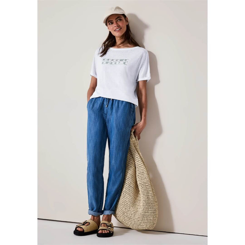Cecil t-paita. Keveä ja ilmava pellavatyyppinen t-paita on siisti ja rento. Monikäyttöinen t-paita o-aukkokoisella pääntiellä ja rintaprintillä. Paidan mitat koossa M on helma 112cm ja pituus 65,5cm