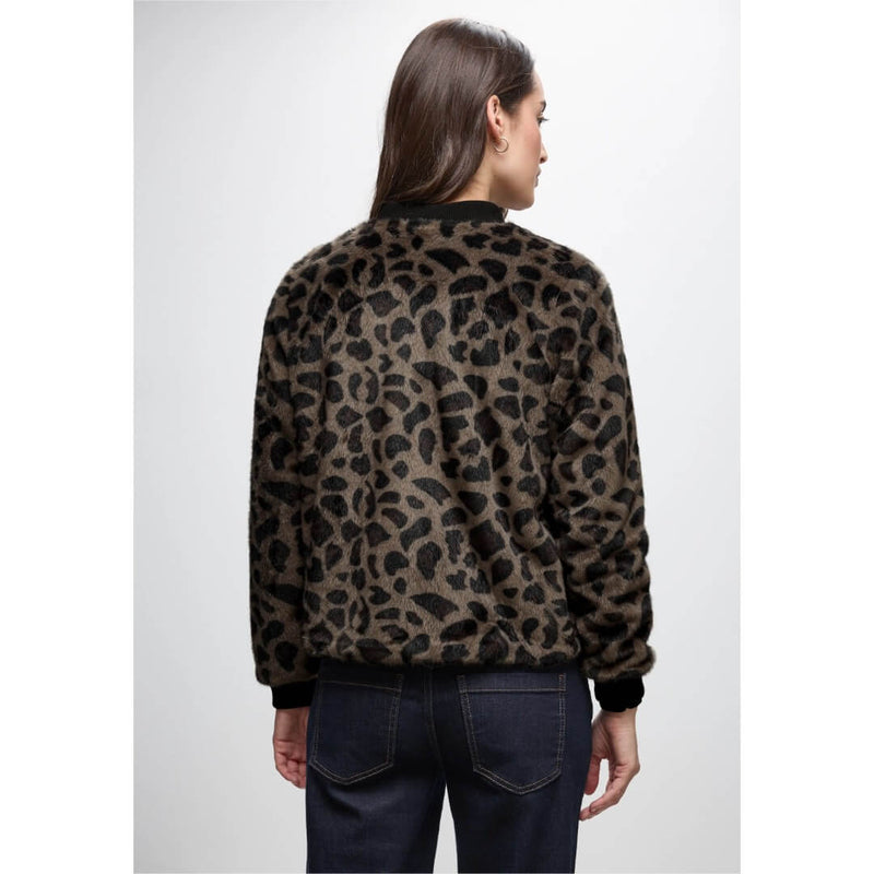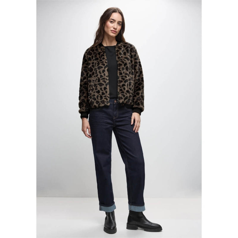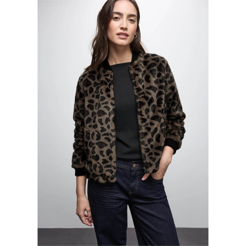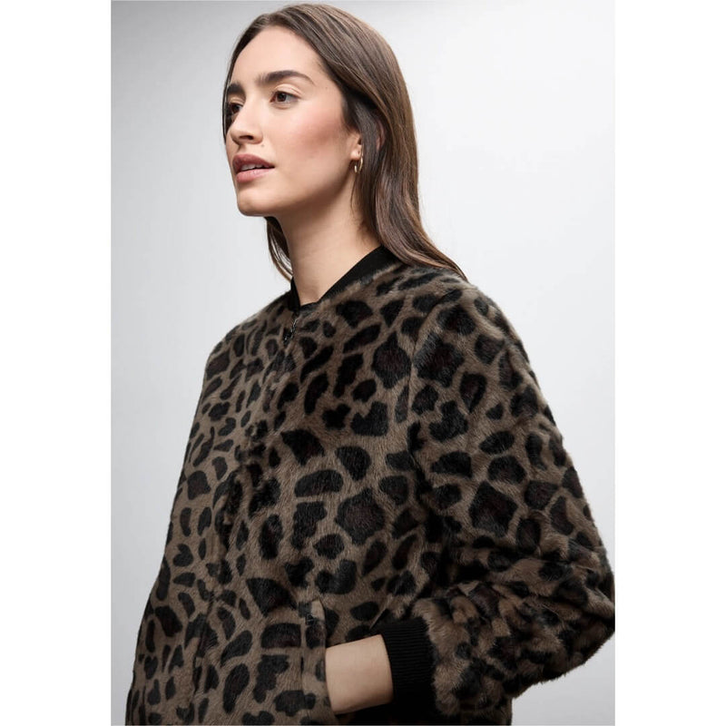 Street One takki. Pehmeä ja todella miellyttävä karvatakki näyttävällä eläinkuosilla. Lyhyessä takissa suosikki bomber-malli, kevyet resori helmassa, matala catalina-kaulus.