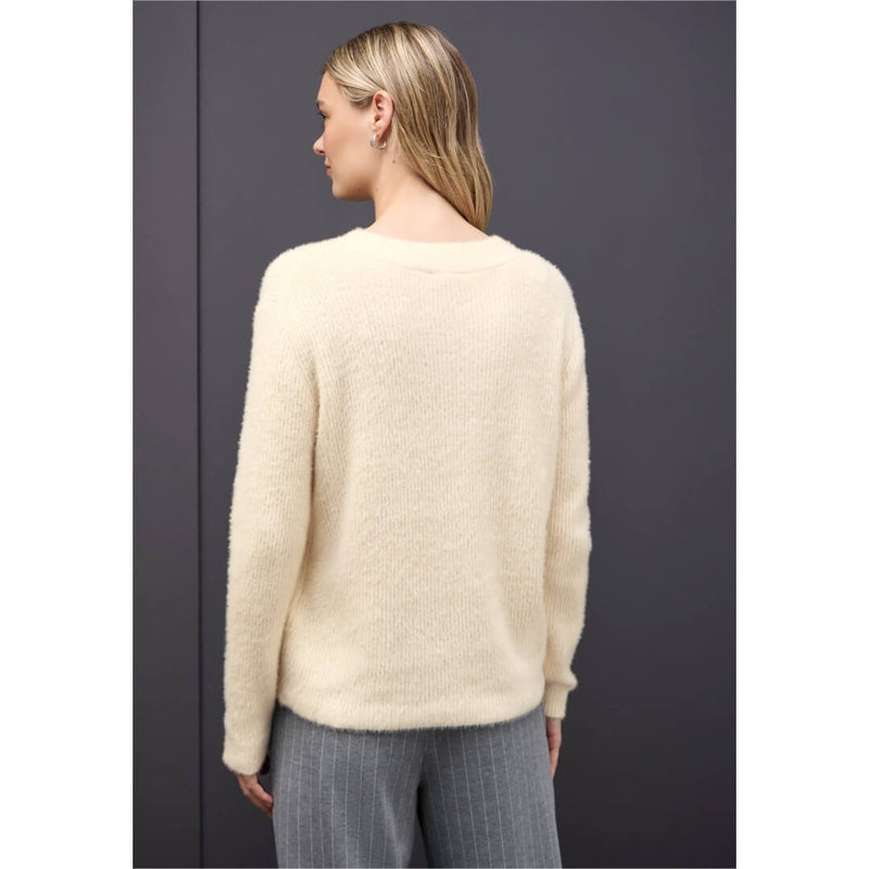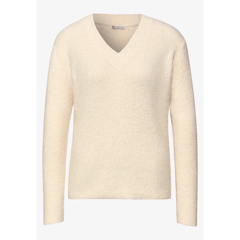 Street One neule. Miellyttävä v-aukkoinen neule on pehmeä ja joustava. Monikäyttöinen perusneule kevyesti pörröinen rib-neulos. Neuleen mitat koossa 38 on rinnanympärys 108cm, helma 104cm ja pituus 60cm