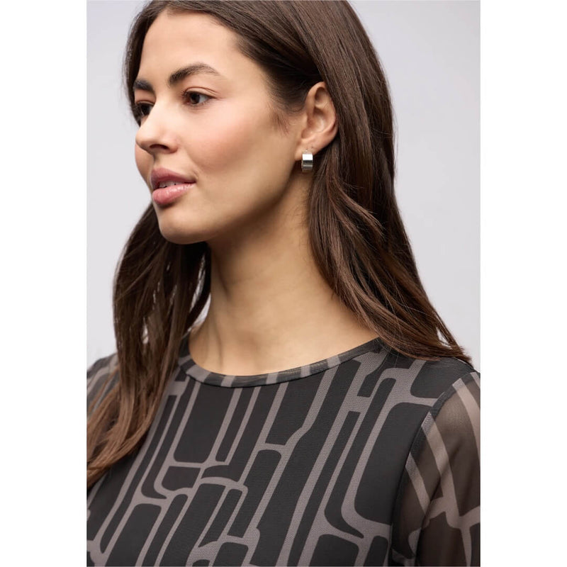 Street One paita. Juhlava kuosipaita o-aukkoisella kaulusella ja mesh-hihoilla. Paidassa hengittävä runko-osa viskoosilaadussa. Miellyttävän keveä ja joustava paita tyylikkäällä kevyesti strukturoidussa laadussa ja näyttävässä ruskeassa graafisessa kuosissa. Paidan mitat koossa 38 on rinnanympärys 92cm, helma 100cm ja pituus 62cm